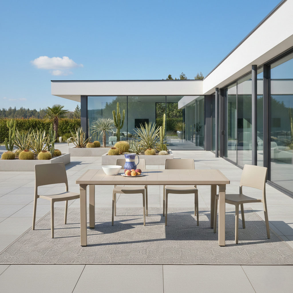 Il tavolo da esterno Ercole combina l’estetica raffinata del piano a effetto doghe in tecnopolimero con una resistenza imbattibile. È l’arredo ideale per ogni ambiente, dal giardino al bordo piscina. ​Dotato di rinforzi sottopiano in acciaio zincato, resiste a vento e intemperie garantendo una durata eccezionale. Include un pratico foro centrale per l’ombrellone, permettendoti di godere i tuoi momenti all’aperto sempre al fresco.
