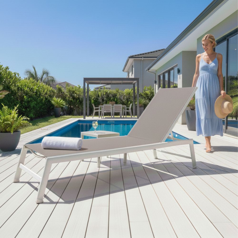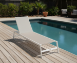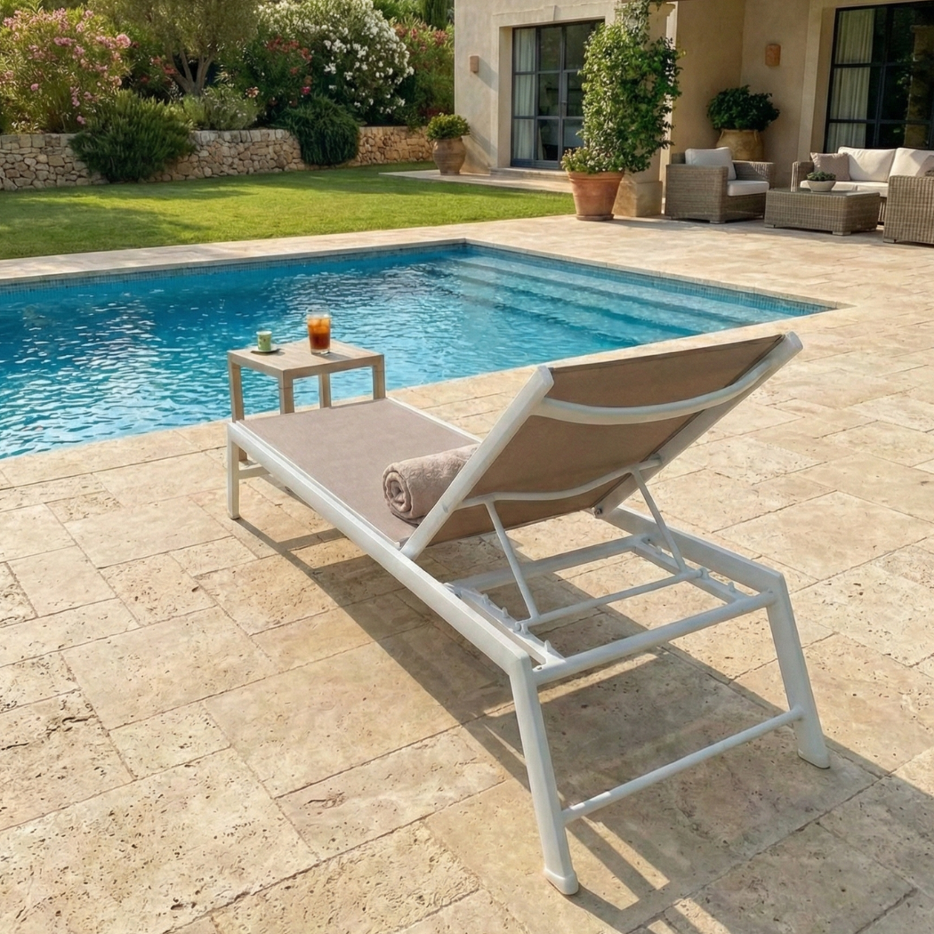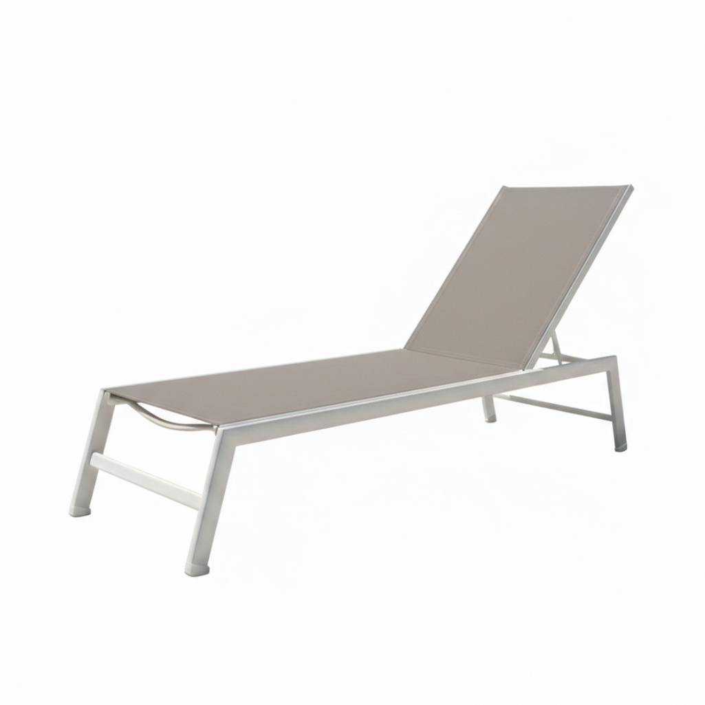 Il lettino Esse 8 combina eleganza minimalista con una struttura in alluminio resistente e un rivestimento in textilene.