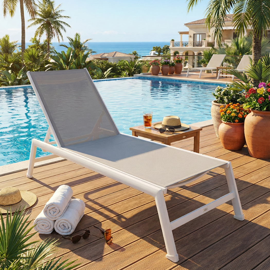 Il tuo relax a bordo piscina merita il meglio! Una struttura leggera e resistente in alluminio progettata per resistere a umidità e salsedine garantendo una durata eccezionale nel tempo. Goditi il sole come preferisci grazie allo schienale regolabile in diverse posizioni ideale per leggere prendere il sole o riposare. Immergiti nel comfort della seduta in textilene un tessuto tecnico traspirante ad asciugatura rapida e resistente ai raggi UV per un benessere fresco anche nelle giornate più calde. Il lettino Esse 8 è disponibile anche nella raffinata variante colore Bianco/Bianco, per un tocco di stile in più. Massima praticità garantita perché è facilmente impilabile l’ideale per ottimizzare gli spazi quando non in uso.