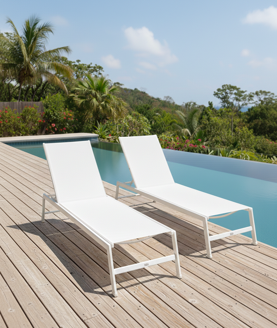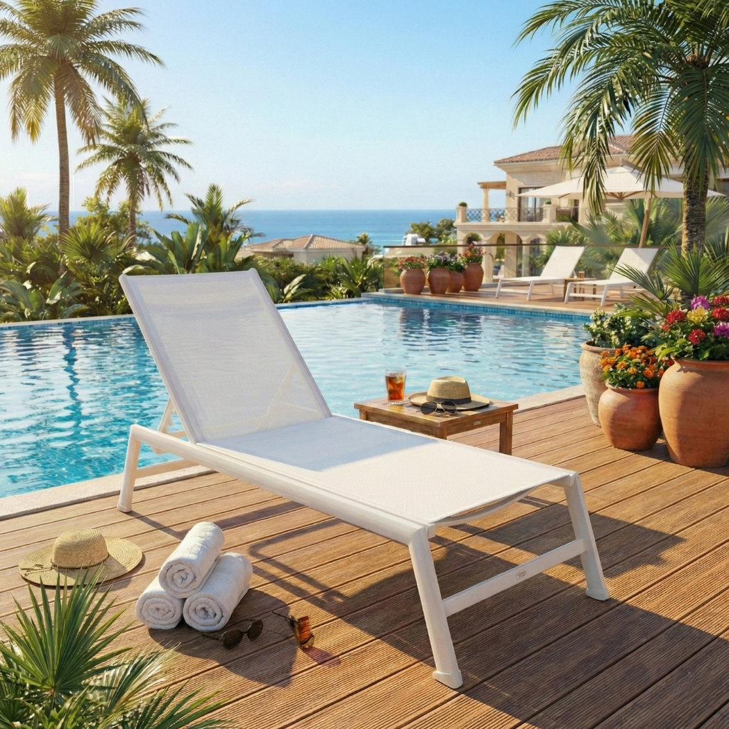 Il tuo relax a bordo piscina merita il meglio! Una struttura leggera e resistente in alluminio progettata per resistere a umidità e salsedine garantendo una durata eccezionale nel tempo. Goditi il sole come preferisci grazie allo schienale regolabile in diverse posizioni ideale per leggere prendere il sole o riposare. Immergiti nel comfort della seduta in textilene un tessuto tecnico traspirante ad asciugatura rapida e resistente ai raggi UV per un benessere fresco anche nelle giornate più calde. Il lettino Esse 8 è disponibile anche nella raffinata variante colore Bianco/Tortora, per un tocco di stile in più. Massima praticità garantita perché è facilmente impilabile l’ideale per ottimizzare gli spazi quando non in uso.