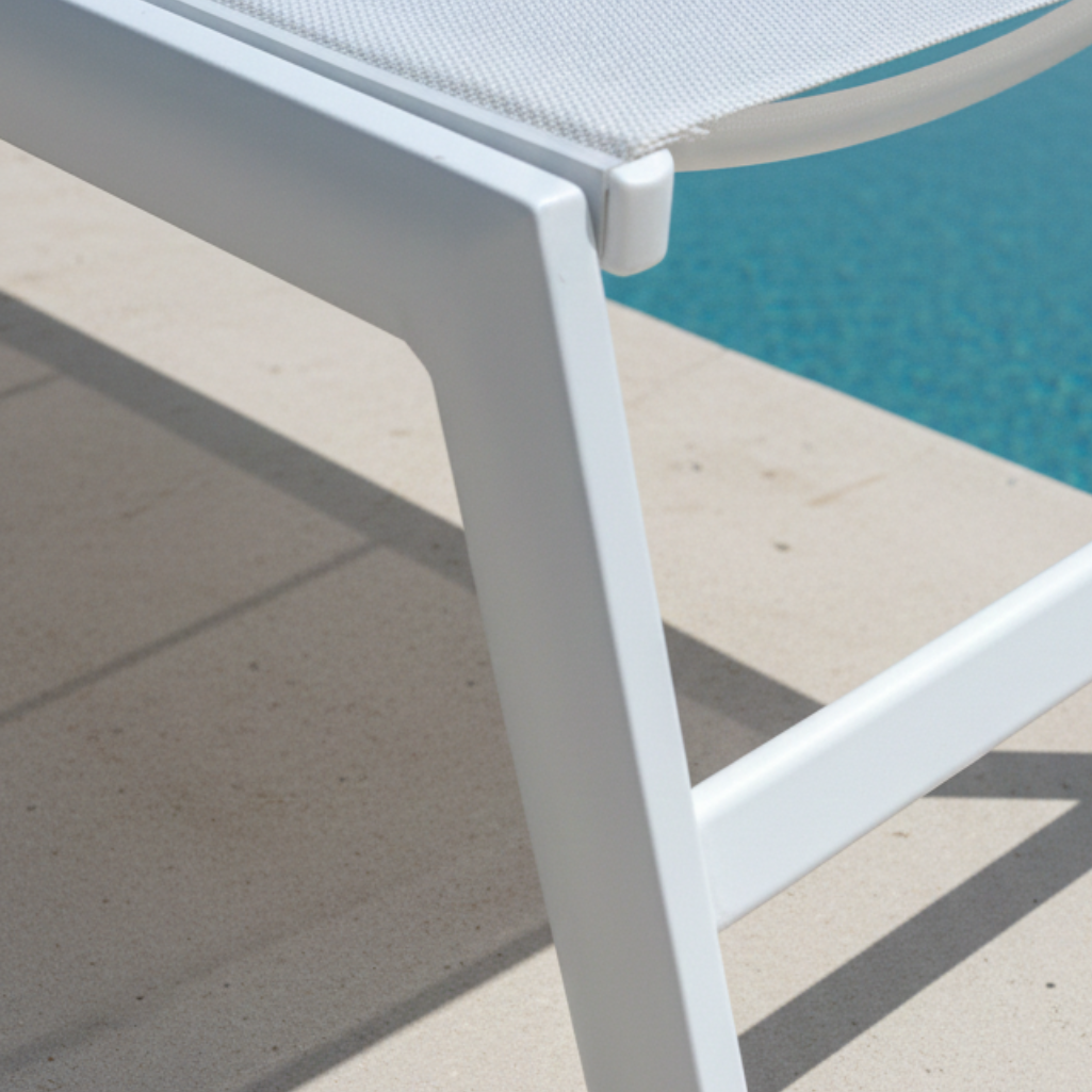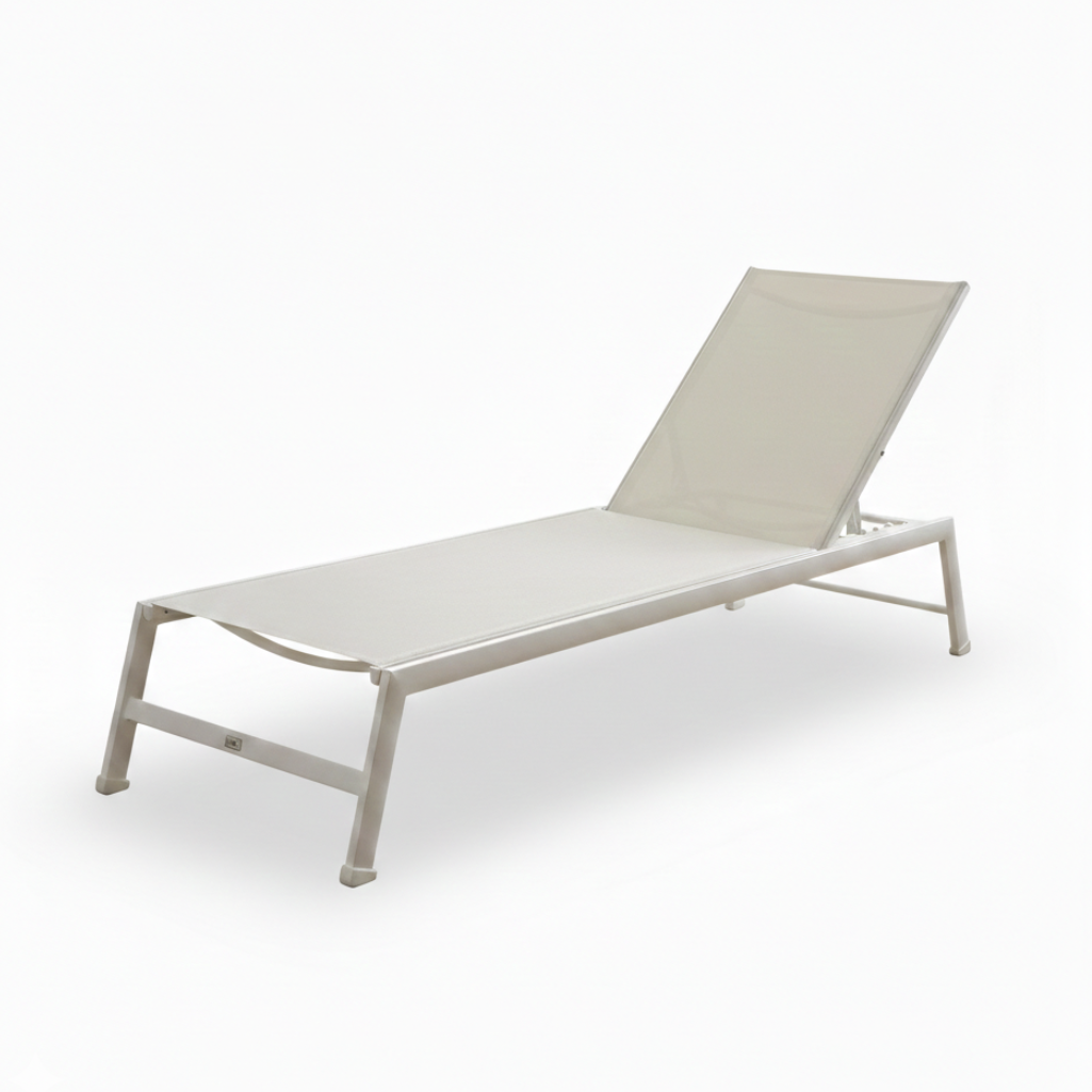 Il lettino Esse 8 combina eleganza minimalista con una struttura in alluminio resistente e un rivestimento in textilene.