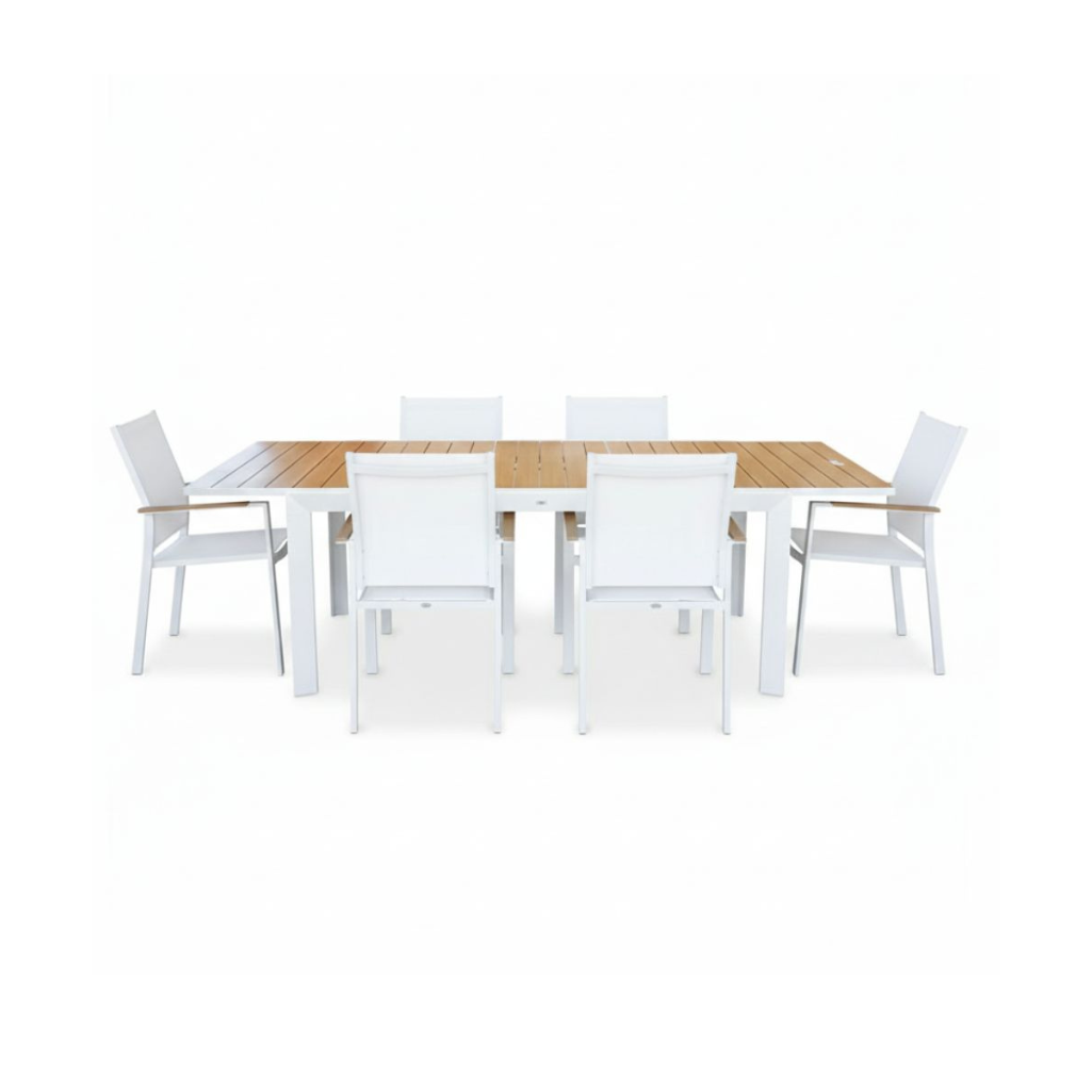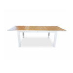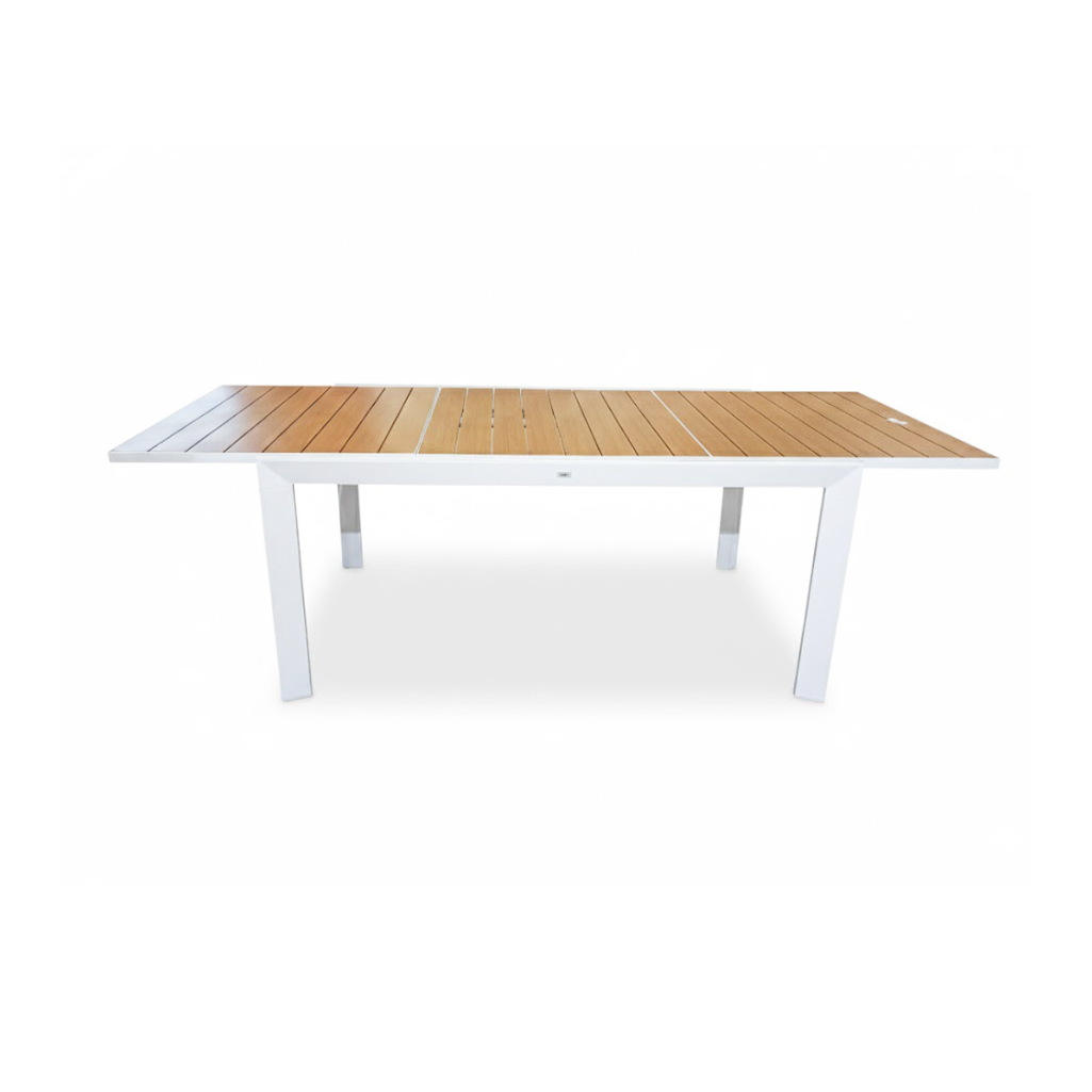 Trasforma il tuo spazio esterno con questo tavolo di design, l’alleato perfetto per i tuoi momenti conviviali all’aperto. ​Il contrasto tra l’elegante struttura interamente in alluminio bianco e il piano con finitura a doghe effetto Teak, anch’esse in alluminio, crea un’estetica moderna e sofisticata. Questa scelta materica garantisce non solo un look ricercato ma anche la massima durabilità e resistenza agli agenti atmosferici, mantenendo la sua bellezza inalterata nel tempo. ​ Le sue linee pulite si adattano perfettamente a qualsiasi arredo, dal più contemporaneo al più rustico.