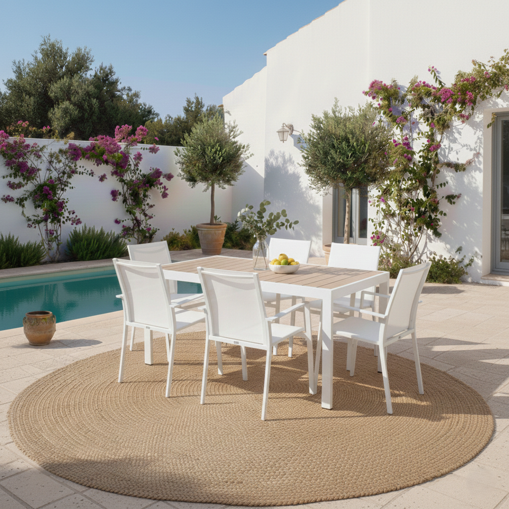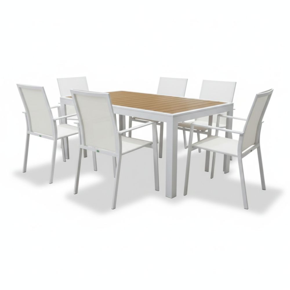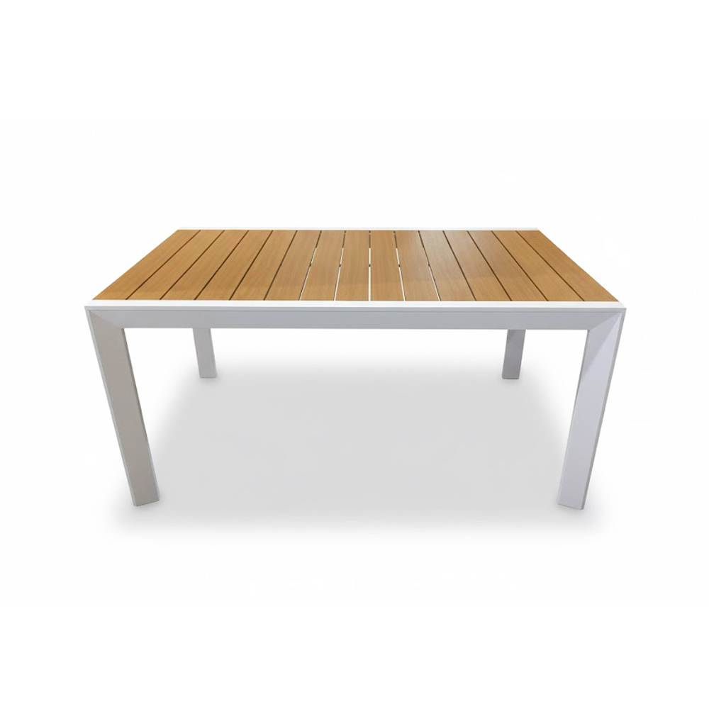 Il tavolo Immenso è interamente realizzato in alluminio bianco, garantito contro ruggine e agenti atmosferici. Il piano, sempre in alluminio con una finitura effetto legno teak , offre il calore del legno senza la sua manutenzione. Scopri il set Tavolo Immenso 150 + 6 Sedia Vanesia, per abbinare al meglio il tuo tavolo.