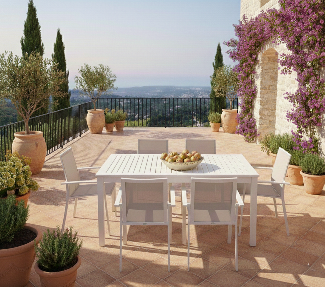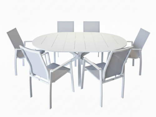 Home Set Tavoli e Sedie INCANTO SET TAVOLO + 6 SEDIE IMPILABILI VANESIA ALLUMINIO BIANCO – OPEN D