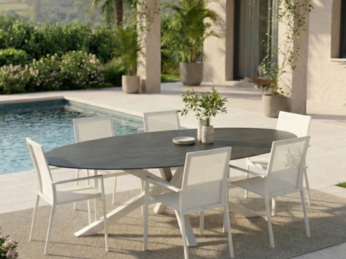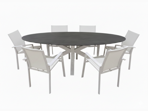 OVALIX SET TAVOLO + 6 SEDIE IMPILABILI VANESIA IN ALLUMINIO E PIANO IN HPL – OPEN D