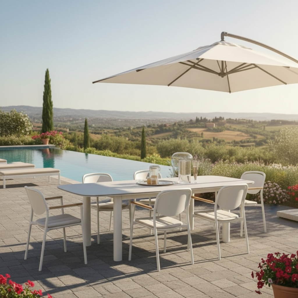 Set da esterno Open D Liquid: eleganza minimale con tavolo e sedie in robusto alluminio per il tuo giardino o terrazzo.