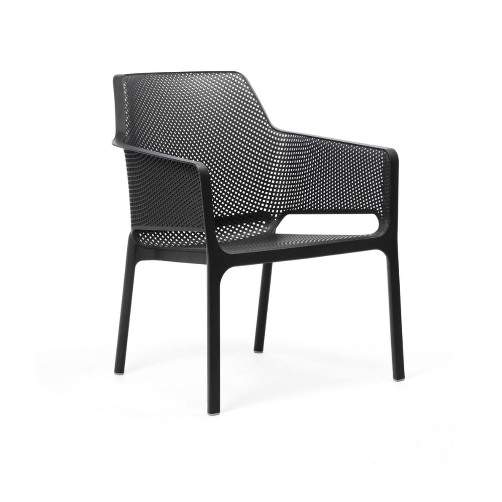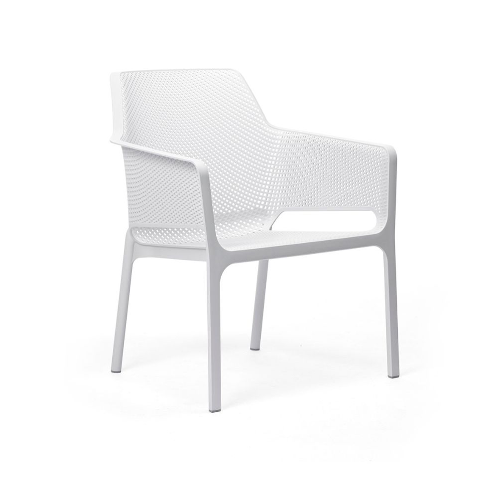 La poltrona Net Relax di Nardi è una seduta da esterno pluripremiata in resina fiberglass, comoda, impilabile e caratterizzata dal distintivo motivo a fori.