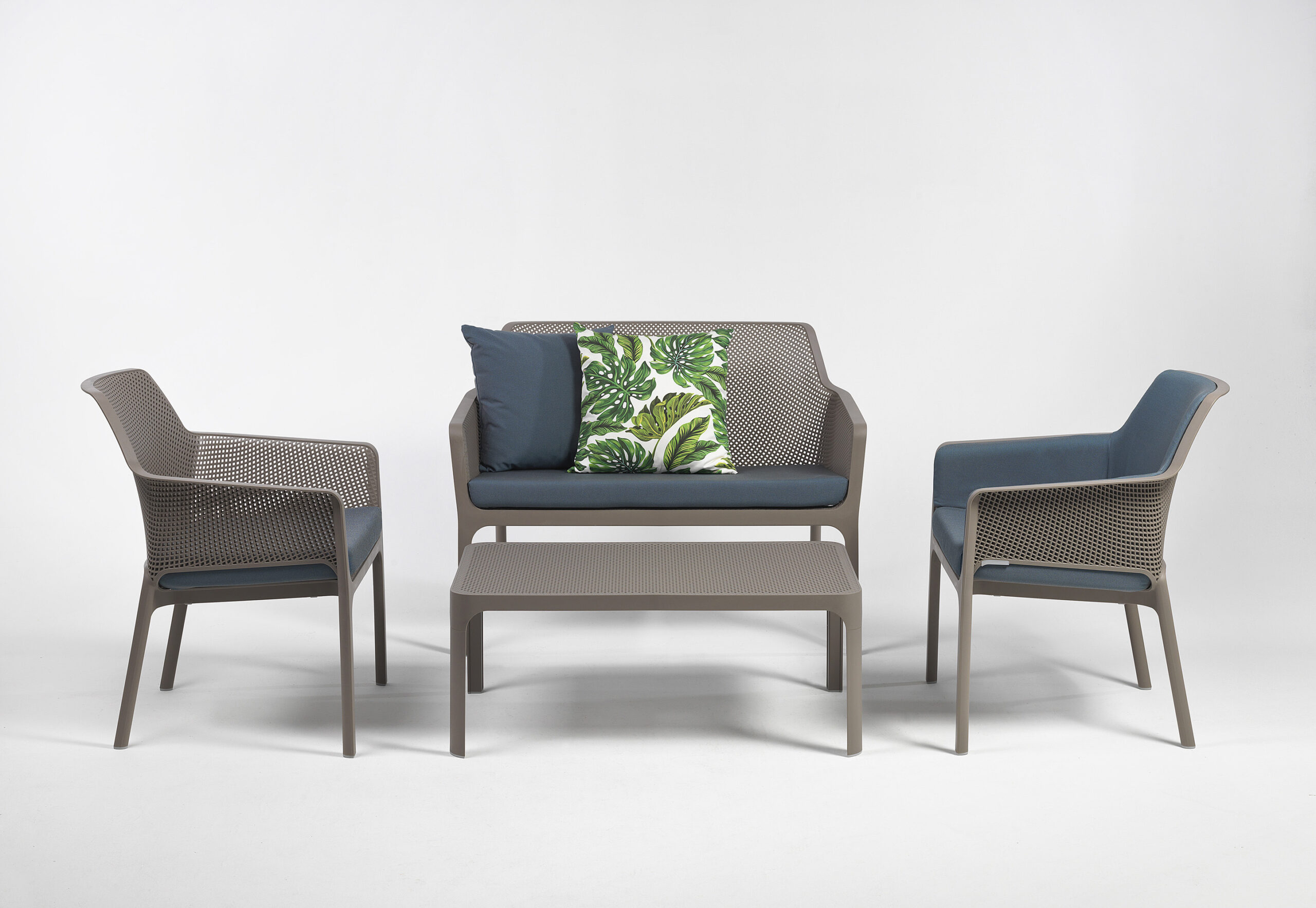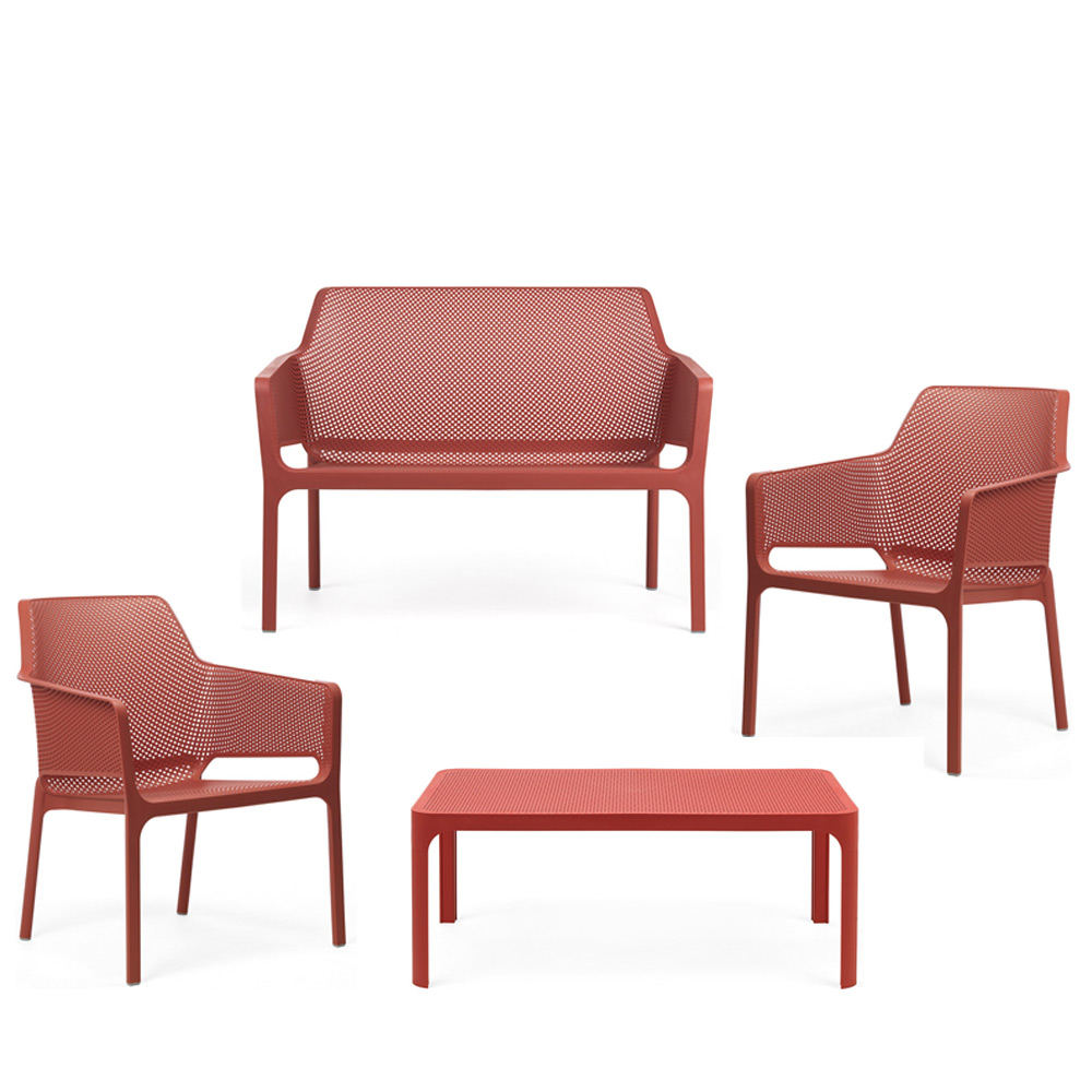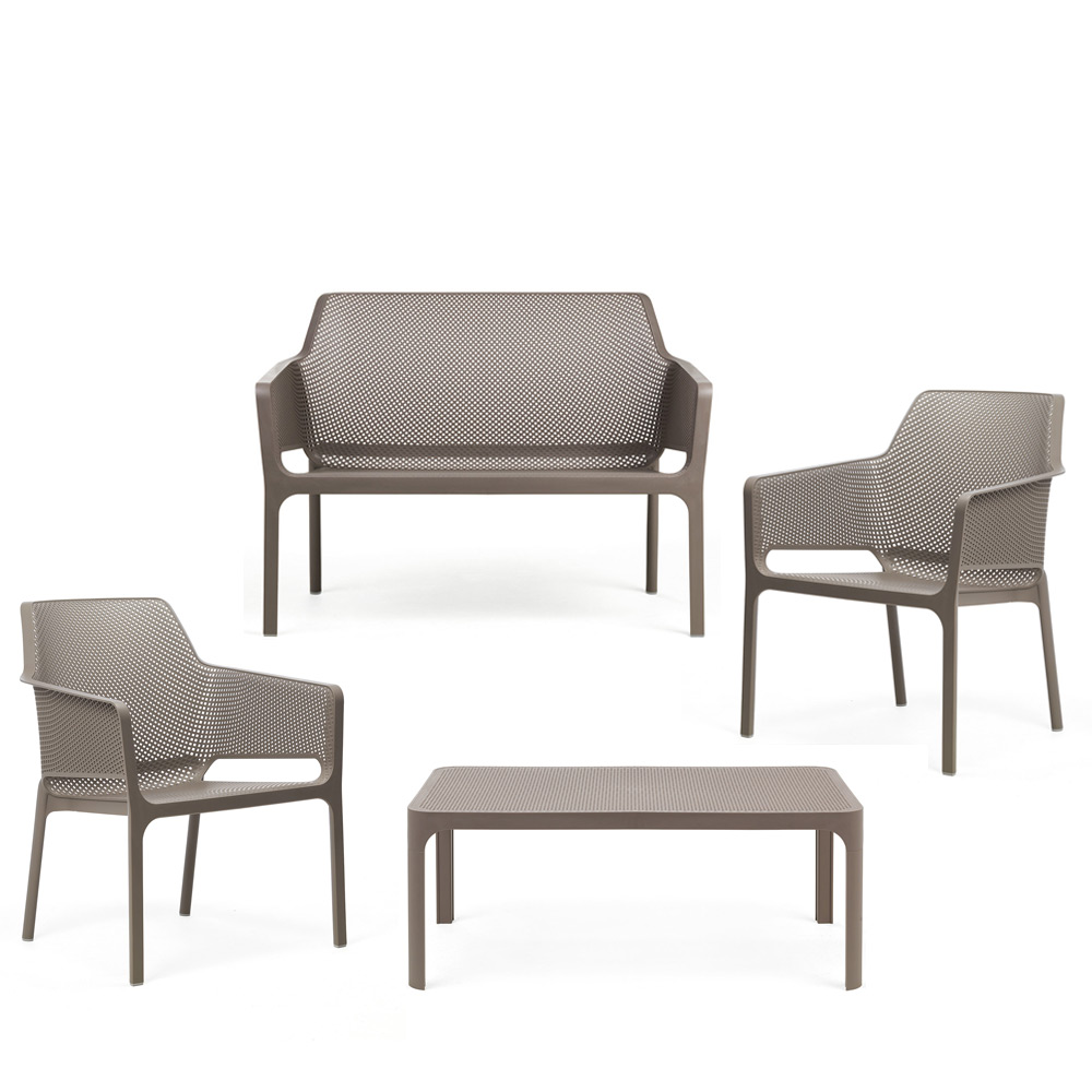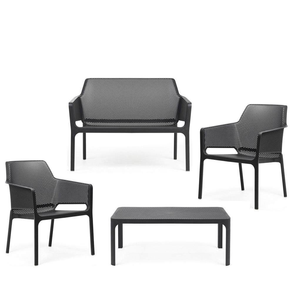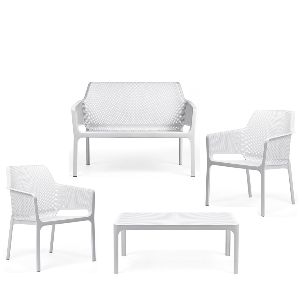 Il Set NET di Nardi è la soluzione completa e di design per l’arredo esterno, composto da un divano, con due poltrone e un tavolino in polipropilene fiberglass effetto traforato.