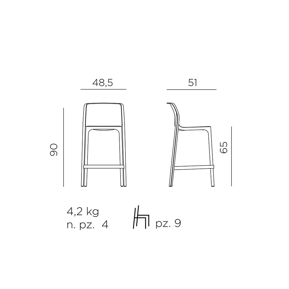 Sgabello monoblocco, in polipropilene fiberglass trattato anti-UV e colorato in massa. Finitura opaca. Dotato di piedini antiscivolo. Altezza seduta 65 cm. Resina riciclabile.