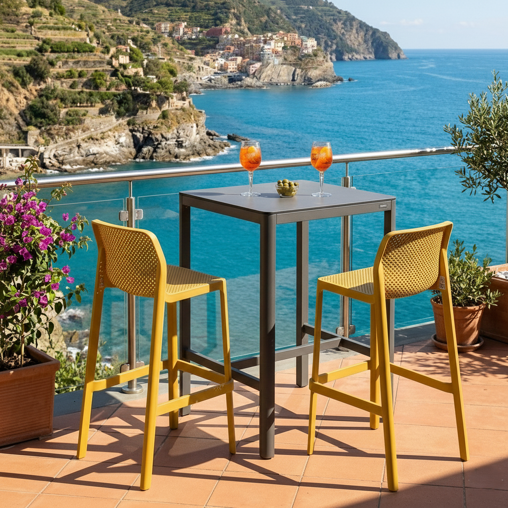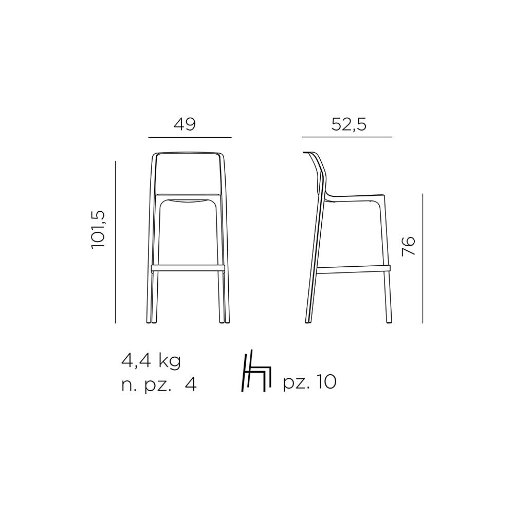 Sgabello monoblocco, in polipropilene fiberglass trattato anti-UV e colorato in massa. Finitura opaca. Dotato di piedini antiscivolo. Altezza seduta 76 cm. Resina riciclabile.