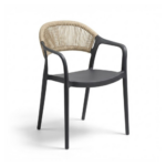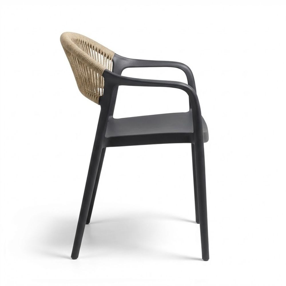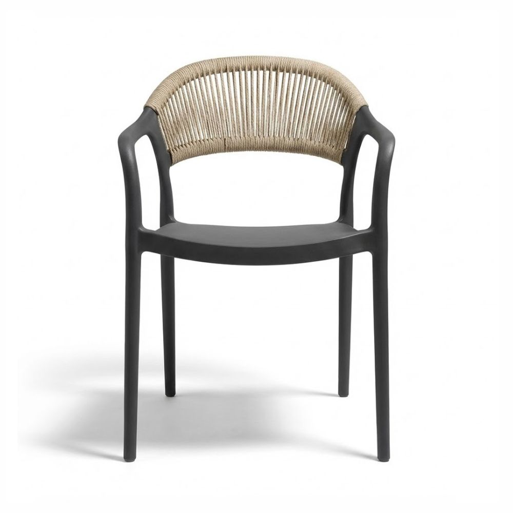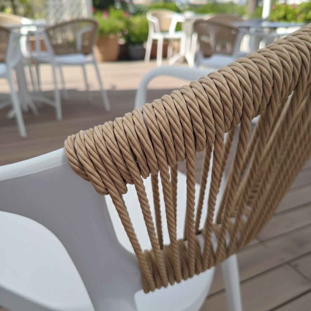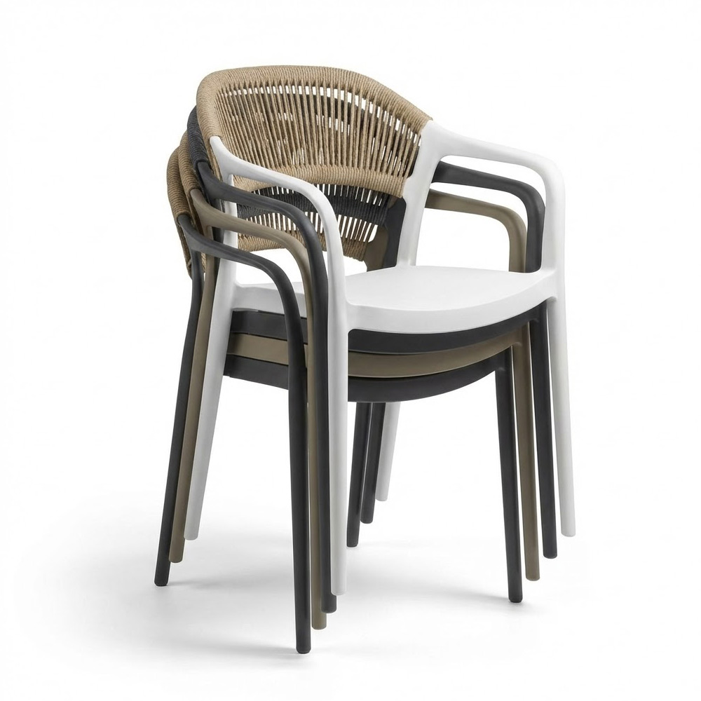 Design Distintivo: La struttura fluida in polipropilene di qualità abbraccia uno schienale unico, realizzato in corda sintetica intrecciata che regala un comfort ergonomico e un look naturale.