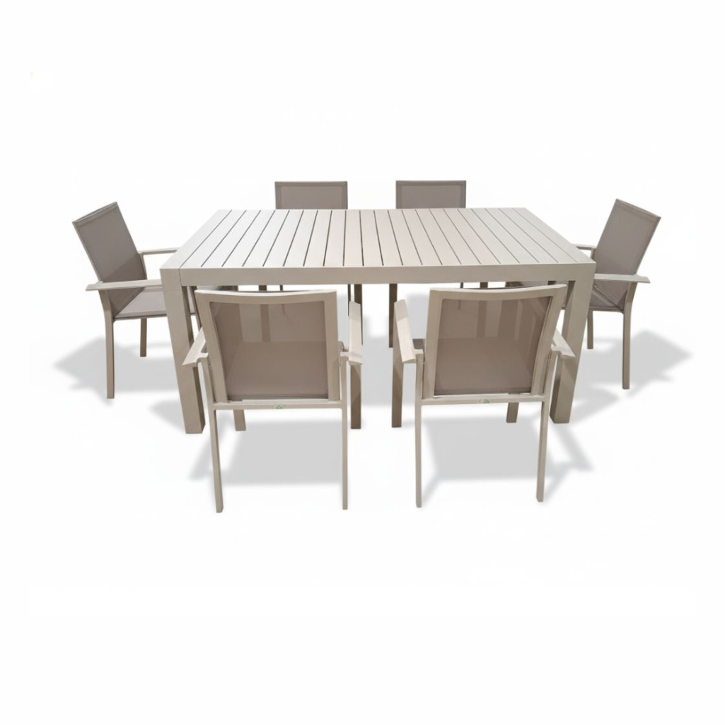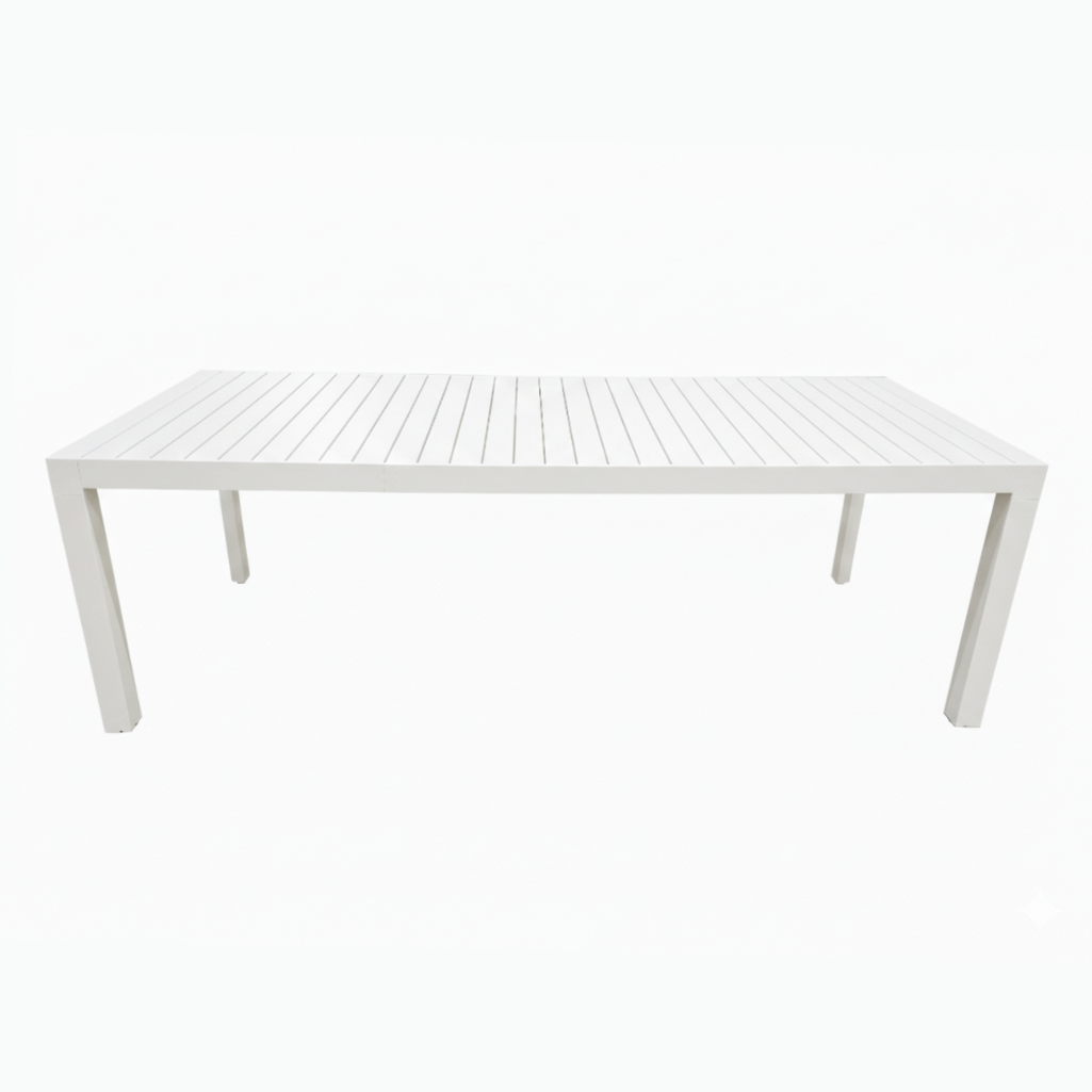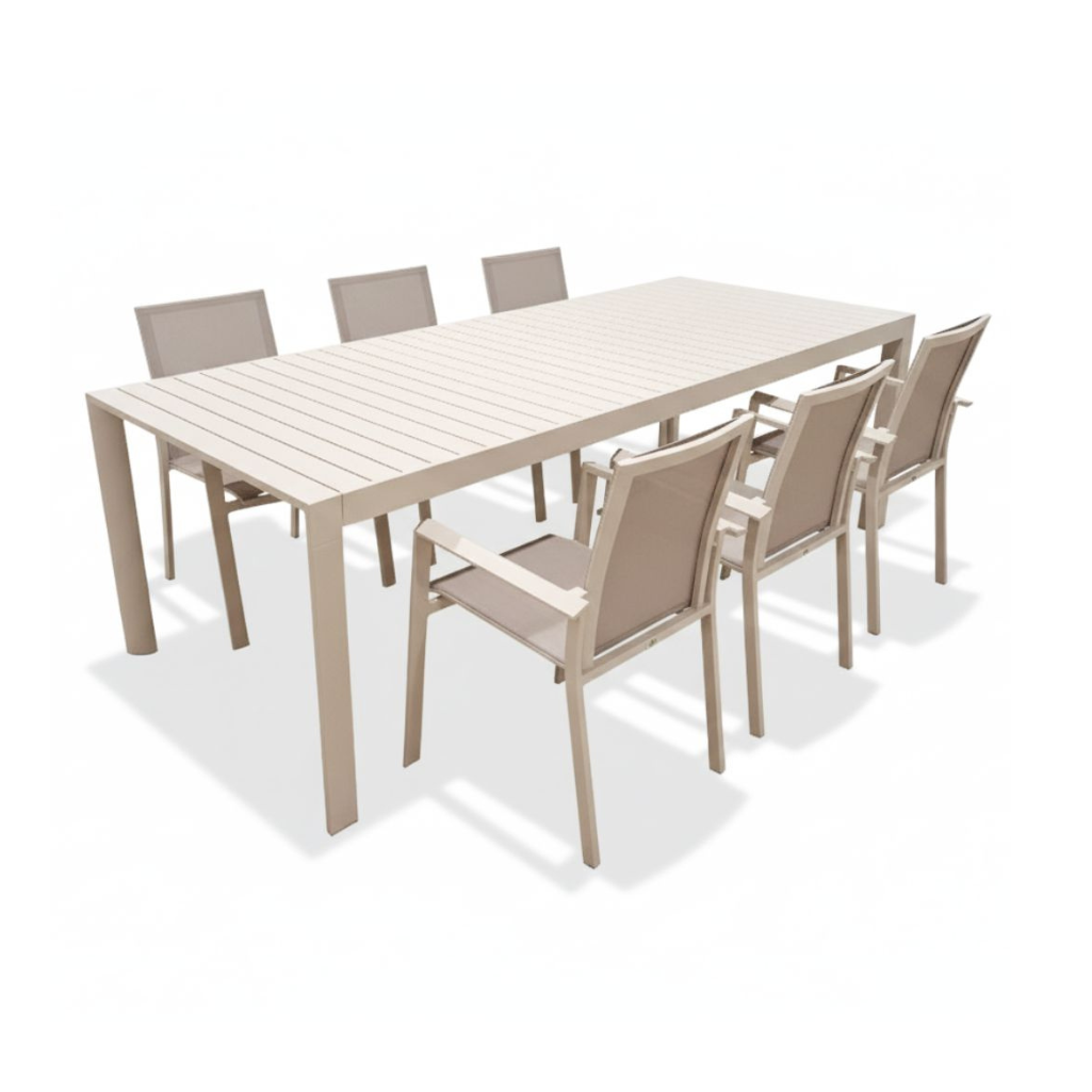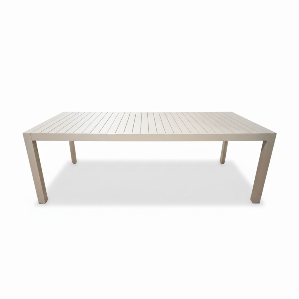 Tavolo da pranzo per esterno che eleva il tuo giardino o terrazzo a un nuovo livello di raffinatezza. Realizzato interamente in alluminio di qualità, questo tavolo rettangolare non solo vanta un design minimalista, ma garantisce anche la massima resistenza agli agenti atmosferici e una manutenzione praticamente nulla. La sua struttura a doghe offre un’estetica moderna e sofisticata. La vera magia è nel meccanismo: pur essendo allungabile, mediante gambe telescopiche una volta aperto mantiene una linea così pulita da non sembrare neanche esteso. Completa il Tavolo con la poltroncina Vanesia e avrai il Set Completo Paysage che include il Tavolo da Pranzo Estensibile + 6 Poltroncine Vanesia, per un arredamento outdoor coordinato e di grande impatto. Vedi anche il tavolo nella colorazione Bianca.
