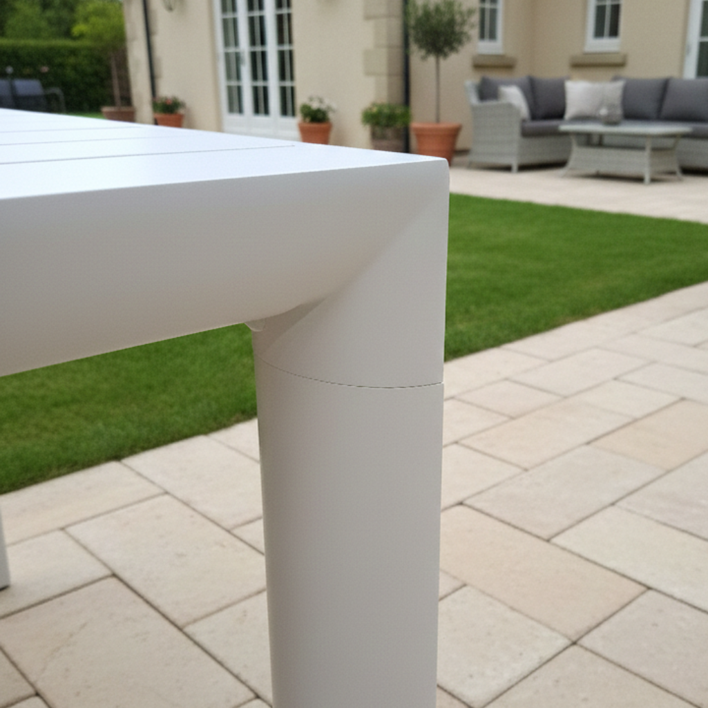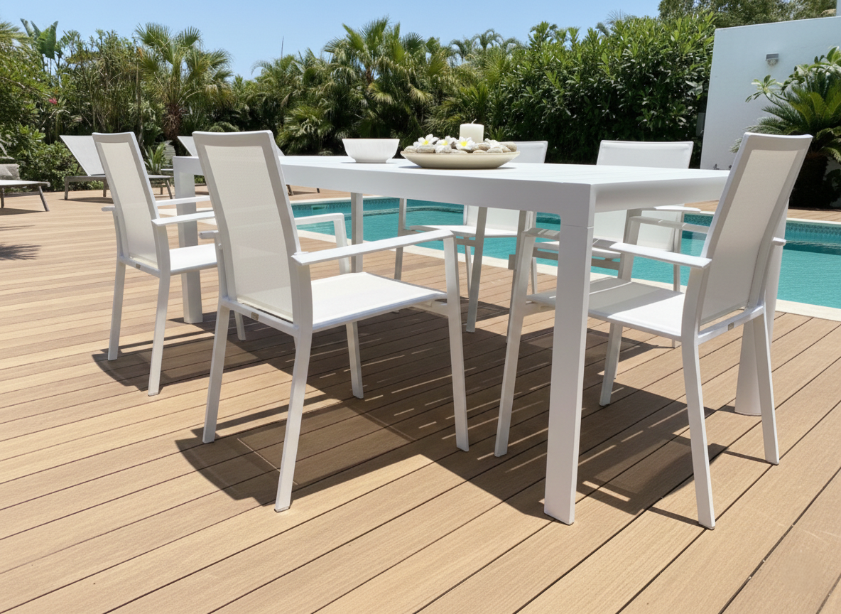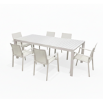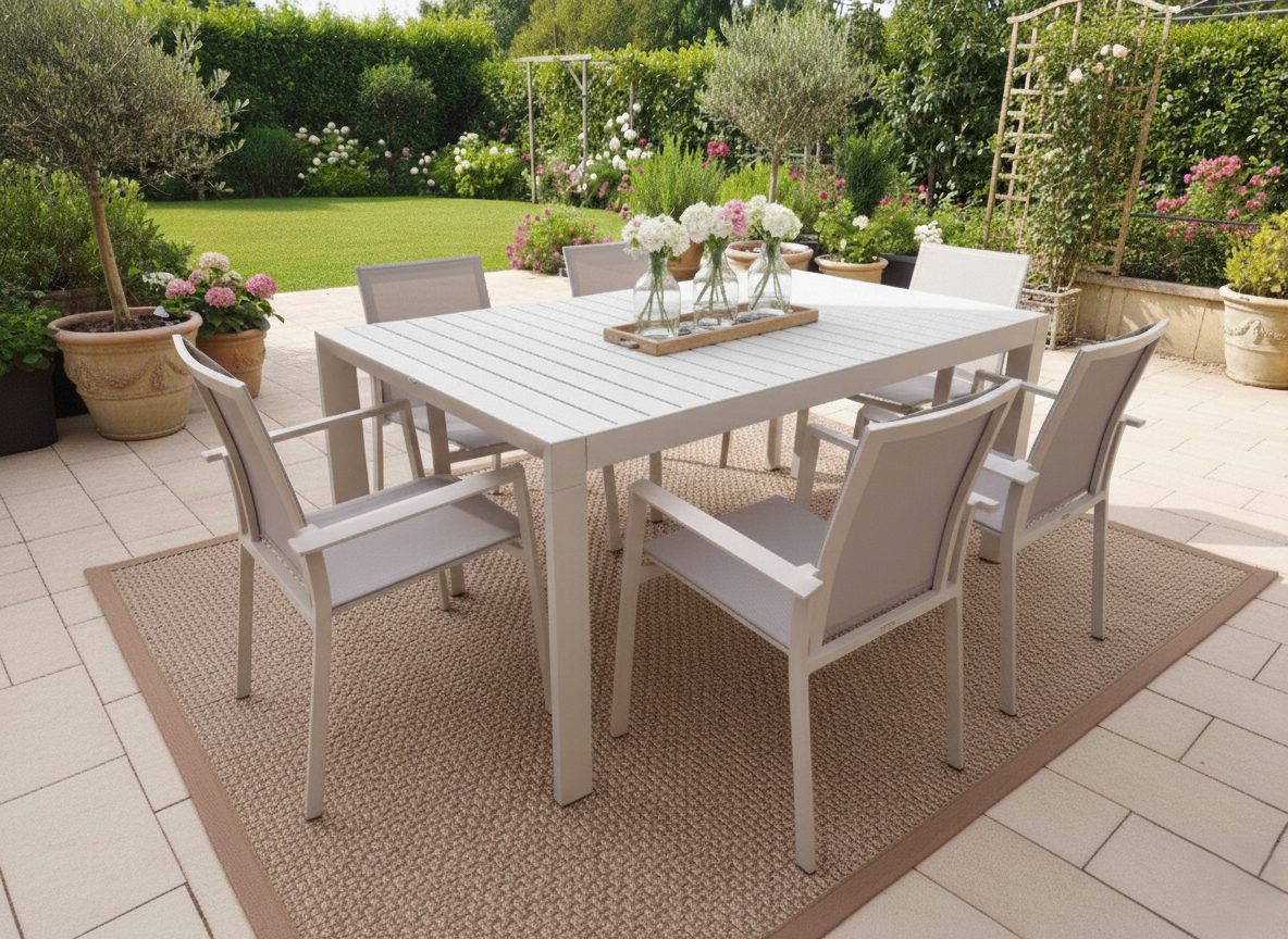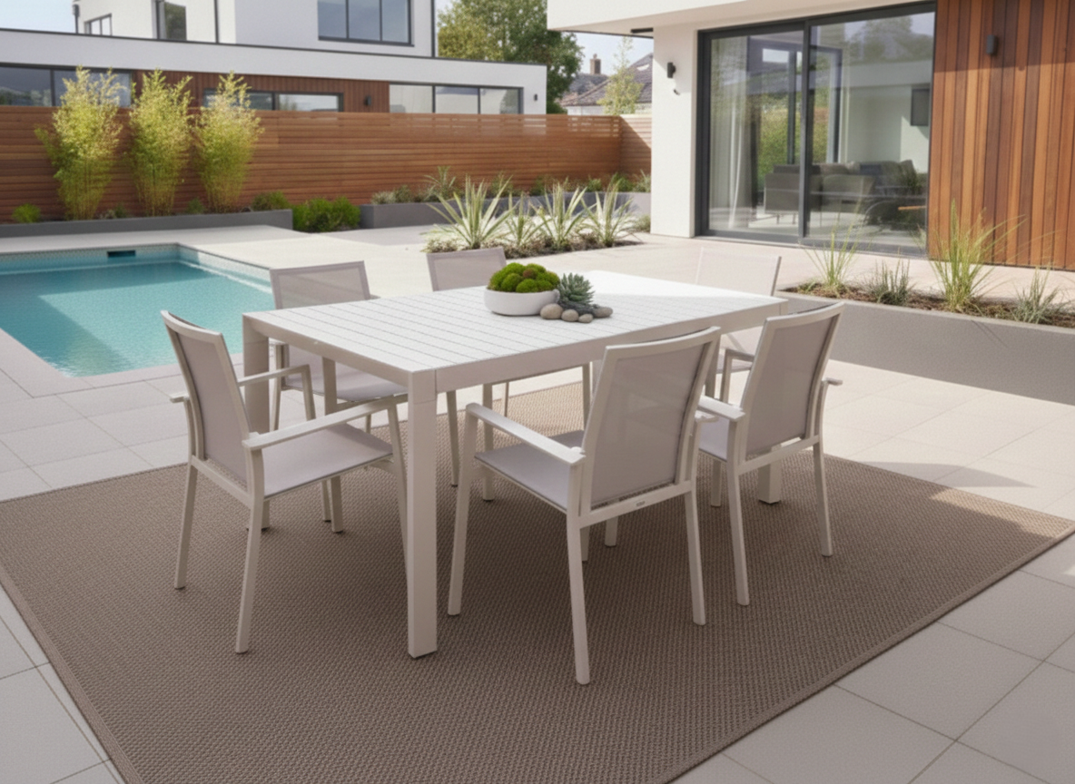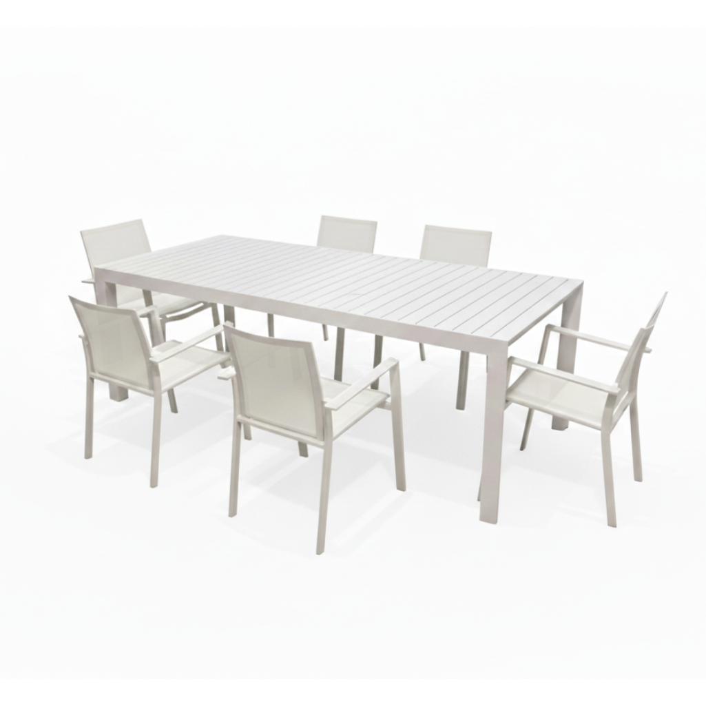 Tavolo da pranzo per esterno che eleva il tuo giardino o terrazzo a un nuovo livello di raffinatezza. Realizzato interamente in alluminio di qualità, questo tavolo rettangolare non solo vanta un design minimalista, ma garantisce anche la massima resistenza agli agenti atmosferici e una manutenzione praticamente nulla. La sua struttura a doghe offre un’estetica moderna e sofisticata. La vera magia è nel meccanismo: pur essendo allungabile, mediante gambe telescopiche una volta aperto mantiene una linea così pulita da non sembrare neanche esteso. Completa il Tavolo con la poltroncina Vanesia e avrai il Set Completo Paysage che include il Tavolo da Pranzo Estensibile + 6 Poltroncine Vanesia, per un arredamento outdoor coordinato e di grande impatto. Vedi anche il tavolo nella colorazione Bianca.