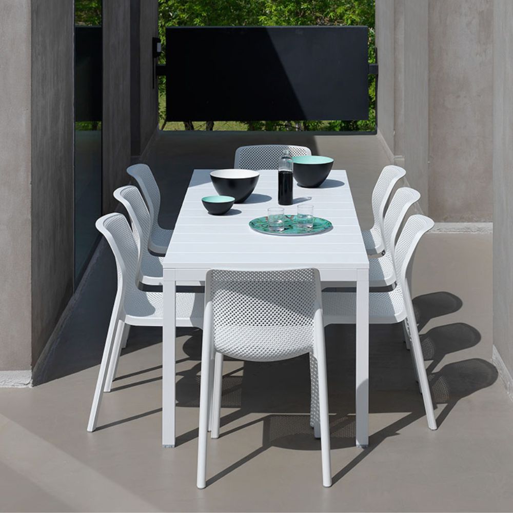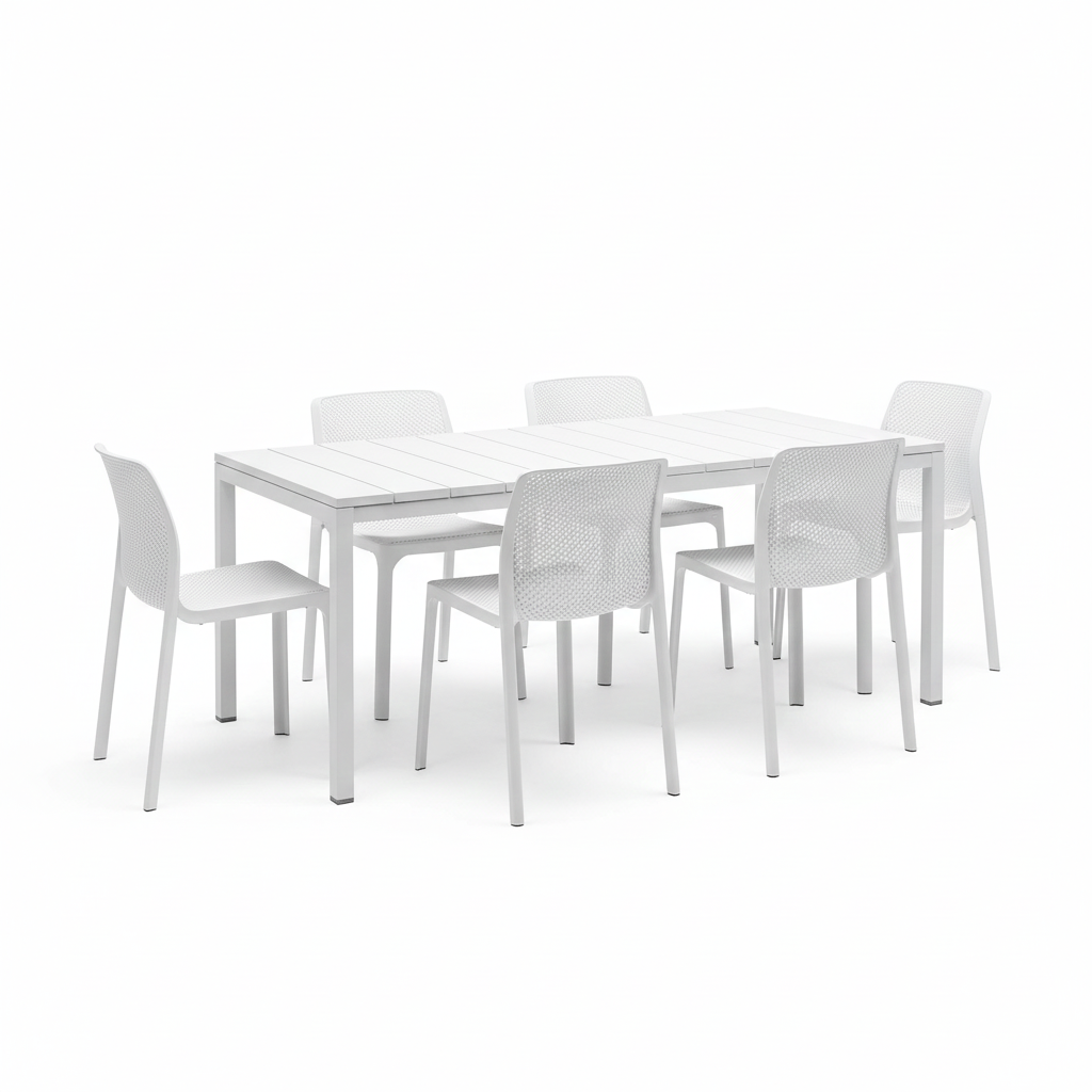 RIO SET TAVOLO 140/210 + 6 SEDIE IMPILABILI BIT BIANCO IN FIBERGLASS – NARDI