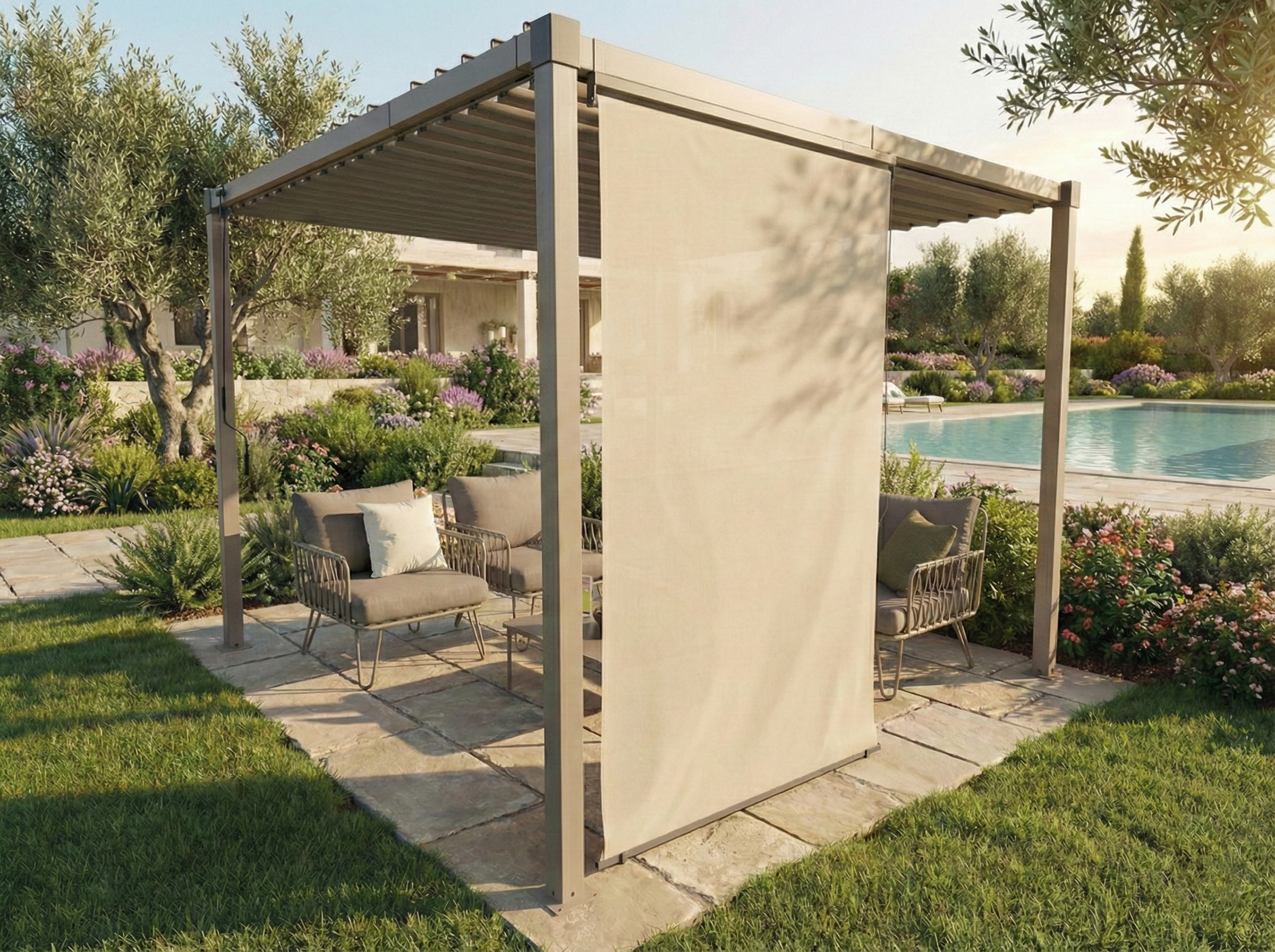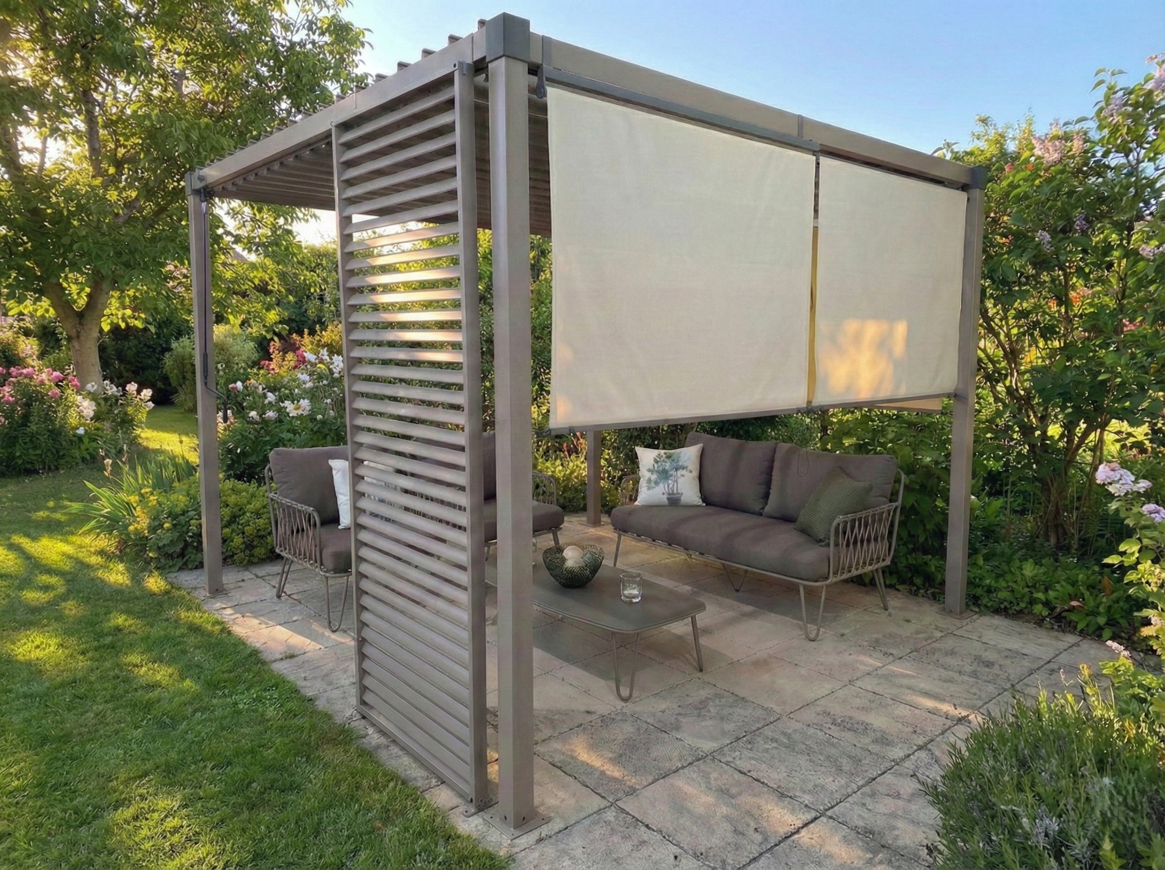 Per chi cerca un tocco di design ancora più strutturato e moderno, è possibile aggiungere l’esclusiva paretina a doghe. Questa soluzione non solo incrementa la privacy, ma trasforma la pergola in una vera e propria stanza all’aperto, offrendo una protezione frangivento elegante e una schermatura visiva permanente dal grande impatto estetico.