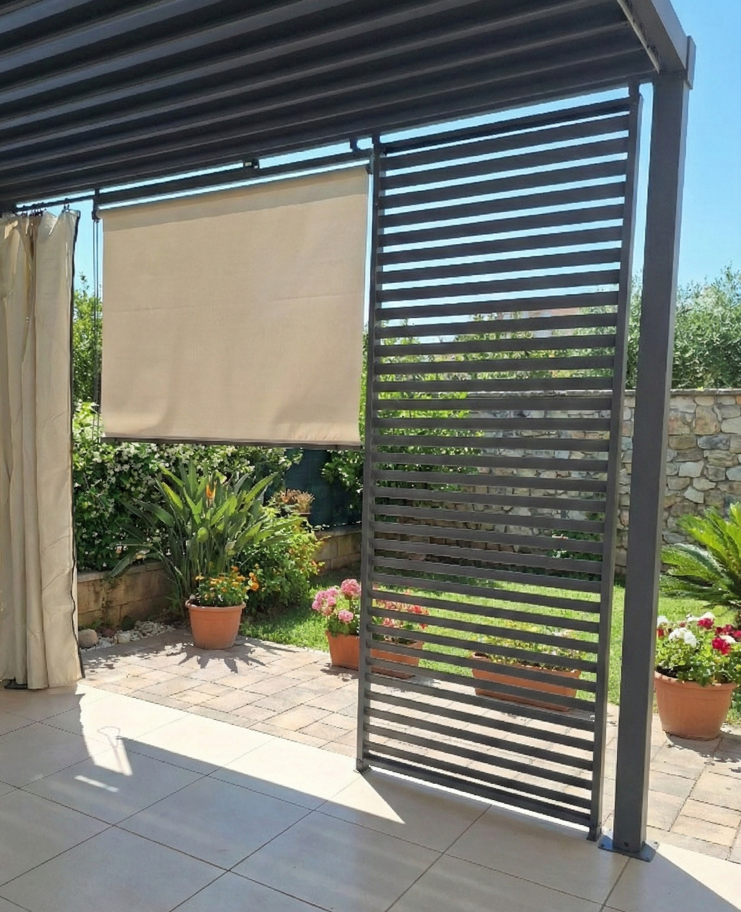 Il mix perfetto: Puoi scegliere la praticità della tenda a rullo, la solidità estetica della paretina a doghe, o combinarle per ottenere il massimo della protezione e dello stile.