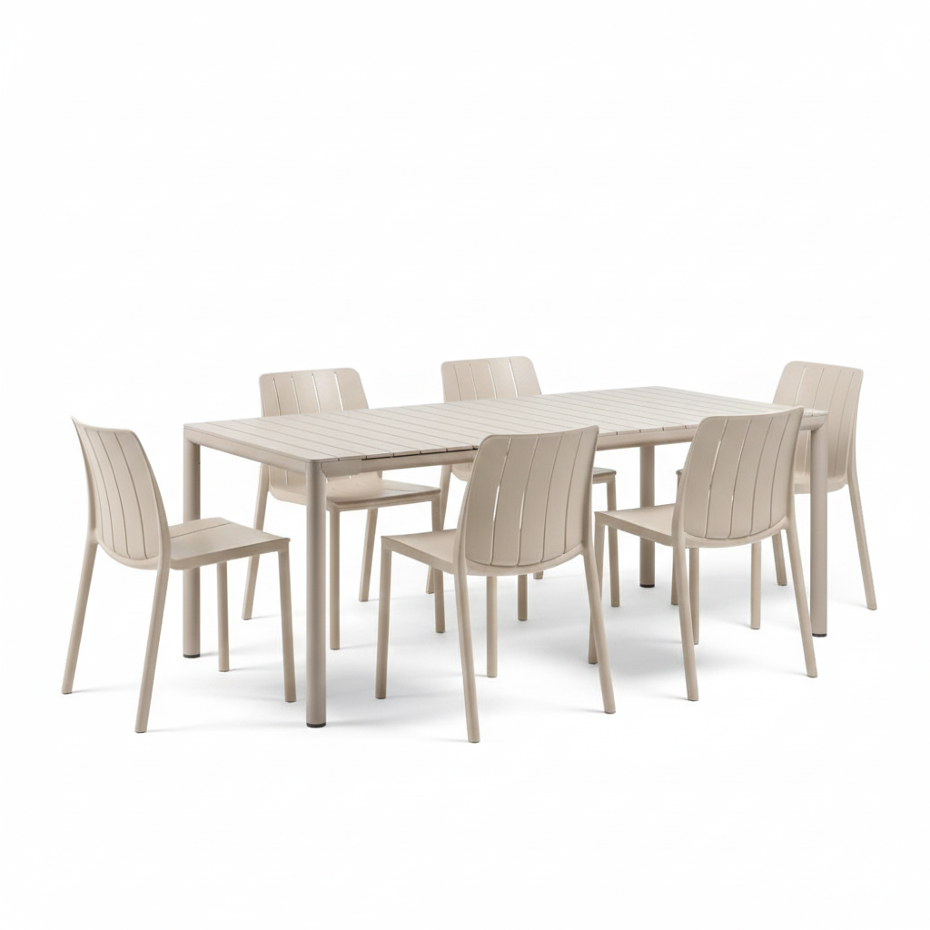 TEVERE SET TAVOLO 147/211 + 6 SEDIE IMPILABILI TIBERINA CORDA IN FIBERGLASS – NARDI
