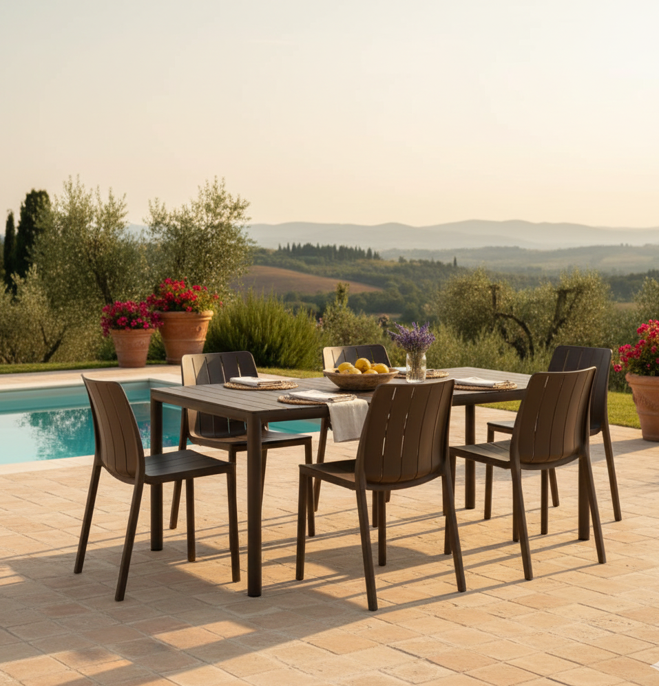 Tevere è il tavolo allungabile da esterno che celebra il tuo spazio all’aperto con un design avvolgente e una profonda anima green. Le sue linee morbide, l’assenza di spigoli vivi e le eleganti forme arrotondate delle gambe creano un’atmosfera rilassata e accogliente. Pensato per la convivialità e per un futuro più sostenibile, Tevere unisce un’estetica raffinata a una coscienza ecologica. È la soluzione ideale per chi cerca un arredo che si espanda con le tue serate, garantendo sempre un comfort visivo e tattile ineguagliabile. La sedia Tiberina è caratterizzata da un design “green” e linee morbide e arrotondate. ​Si tratta di una sedia monoblocco senza braccioli, con una struttura a doghe e gambe di forma circolare. Realizzata in resina riciclabile, Polipropilene fiberglass, trattato per resistere ai raggi UV e colorato in massa, garantendo una maggiore durabilità del colore. Dotata di piedini antiscivolo per una maggiore stabilità.
