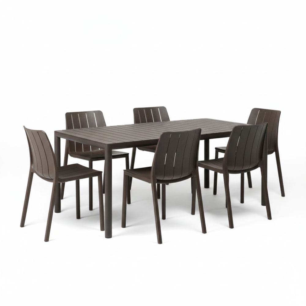 Set da pranzo Nardi per esterno che include il tavolo Tevere allungabile da 147 a 211 cm e 6 comode sedie Tiberina colore Terra.